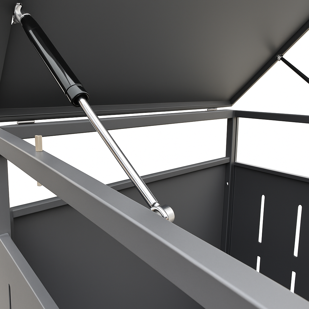 The top lid is equipped with premium gas-lift hinges that open smoothly and hold the cover in place without slamming. This makes everyday use effortless — no more struggling with heavy lids while carrying trash bags.